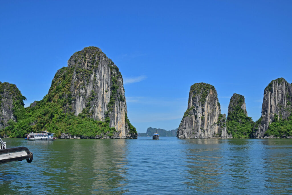 ハロン湾の観光には、ハノイから車で約3時間かかります。日帰りや1泊2日のツアーが一般的で、訪れる際には日焼け止めや防寒対策を忘れずに持参しましょう。特に有名な奇岩「闘鶏岩」や「ティエンクン洞窟」など、見どころが満載です。
