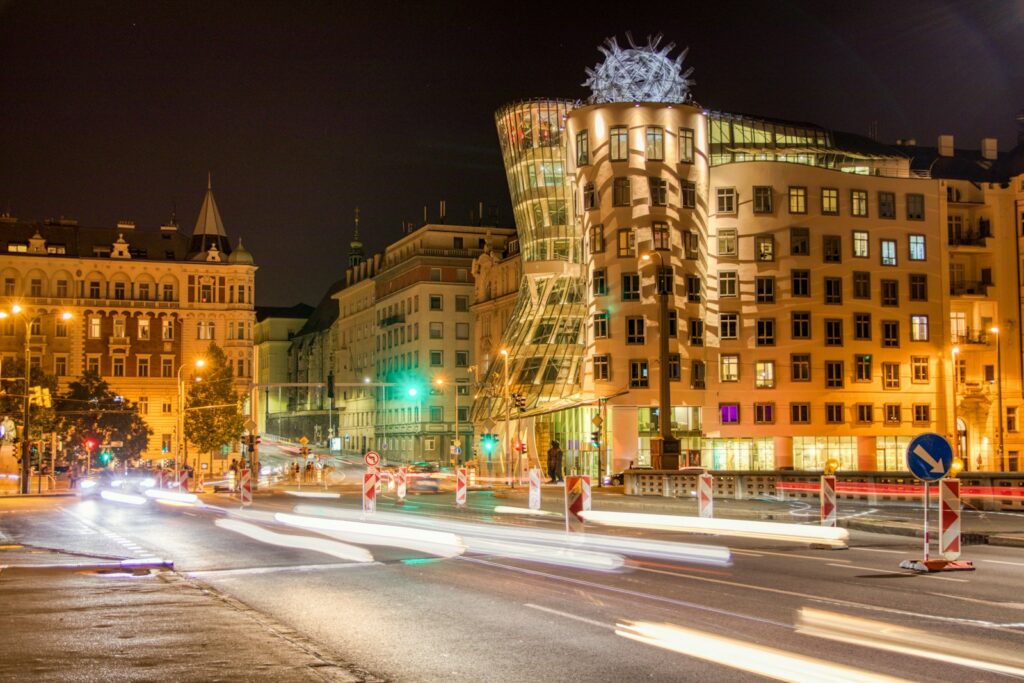 夕方には、プラハのモダンな建築の象徴であるダンシングハウスを見学しましょう。このユニークな建物は、フランク・ゲーリーとヴラド・ミルニッチによって設計され、その曲線美が特徴です。