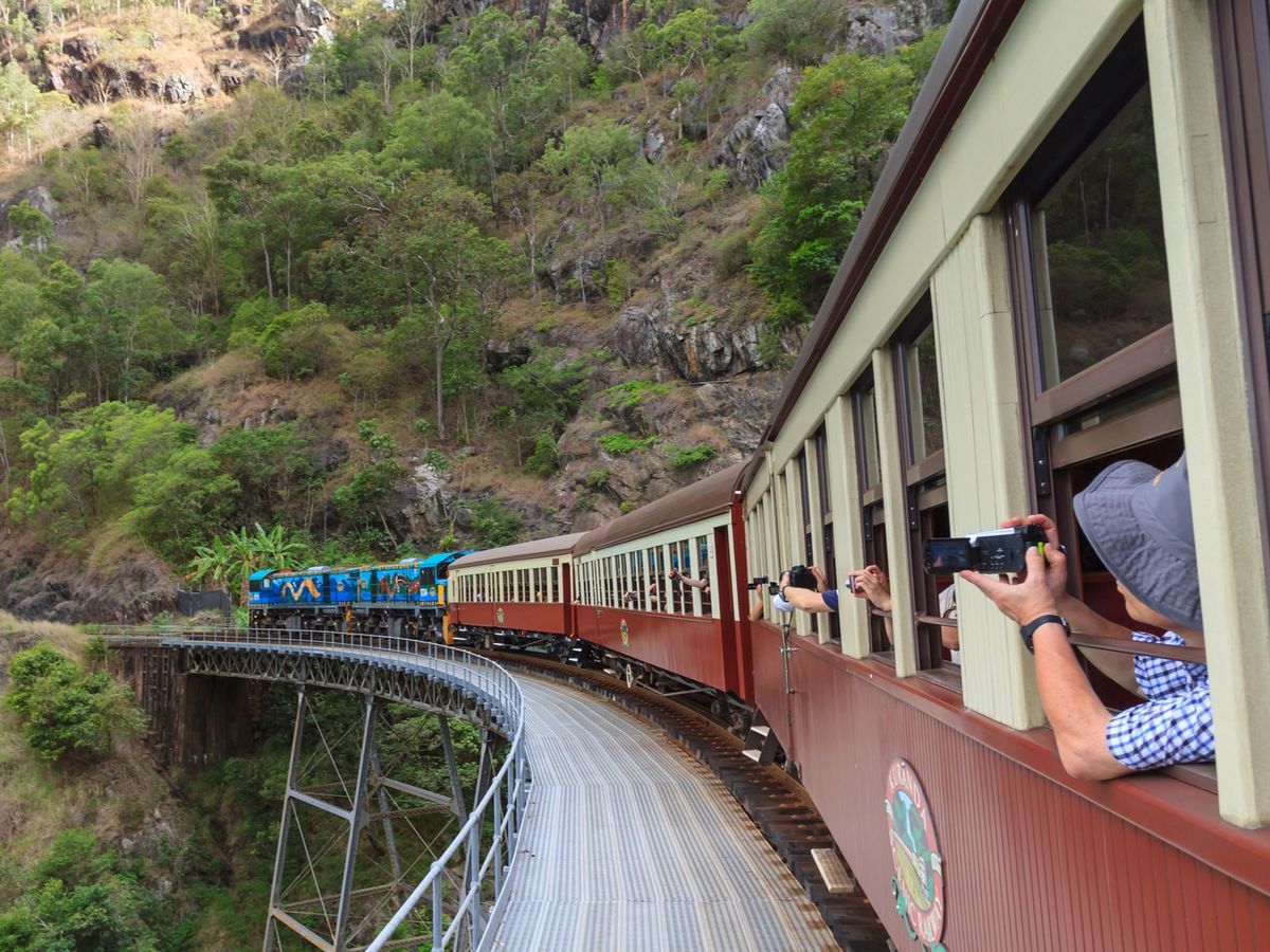 旅の始まりを彩るのは、100年以上の歴史を誇る「キュランダ高原鉄道」。かつてテレビ番組『世界の車窓から』のオープニングを飾ったことでも知られるこの列車は、レトロな木造客車が魅力です。ダイミックな180度のヘアピンカーブや、激しく流れ落ちるバロン滝を車窓から眺めも見どころ。