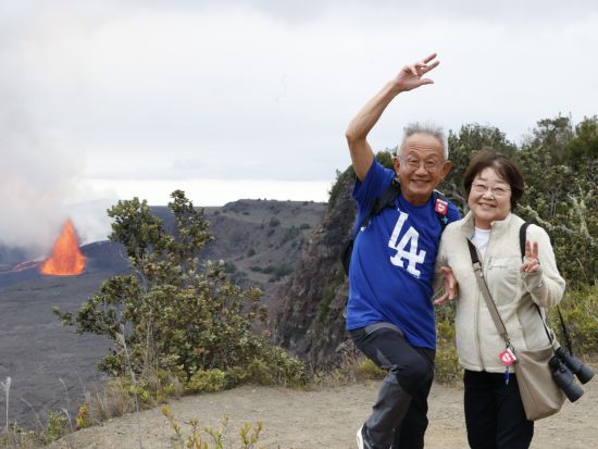 噴火活動中は赤く湧き上がる溶岩を展望台から安全に見学します。