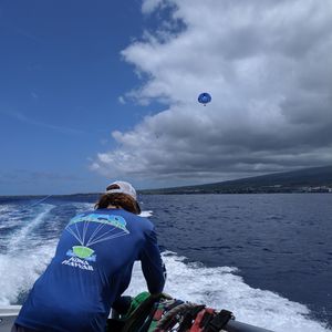 モーターボートに乗り込み沖に出ますが、青くて綺麗な空と海、それだけでも最高です。乗客は6名で、2人一組ごとにライフベスト、安全ベルトをつけて準備します。パラシュートが開きあっという間に空高く上がります。揺れは全く感じません。カイルアコナの町がよく見えます。フライト時間は10分ほどでした。