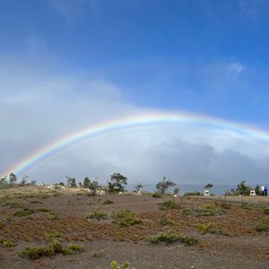 キラウェア火山の火口では火柱は見られませんでしたが、火口に虹がかかって荘大な景色でした。