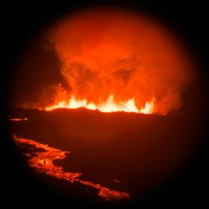 真っ赤な溶岩噴出と大地に広がる幾重もの赤い筋。