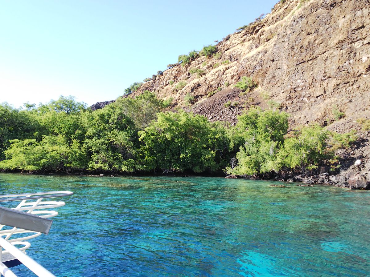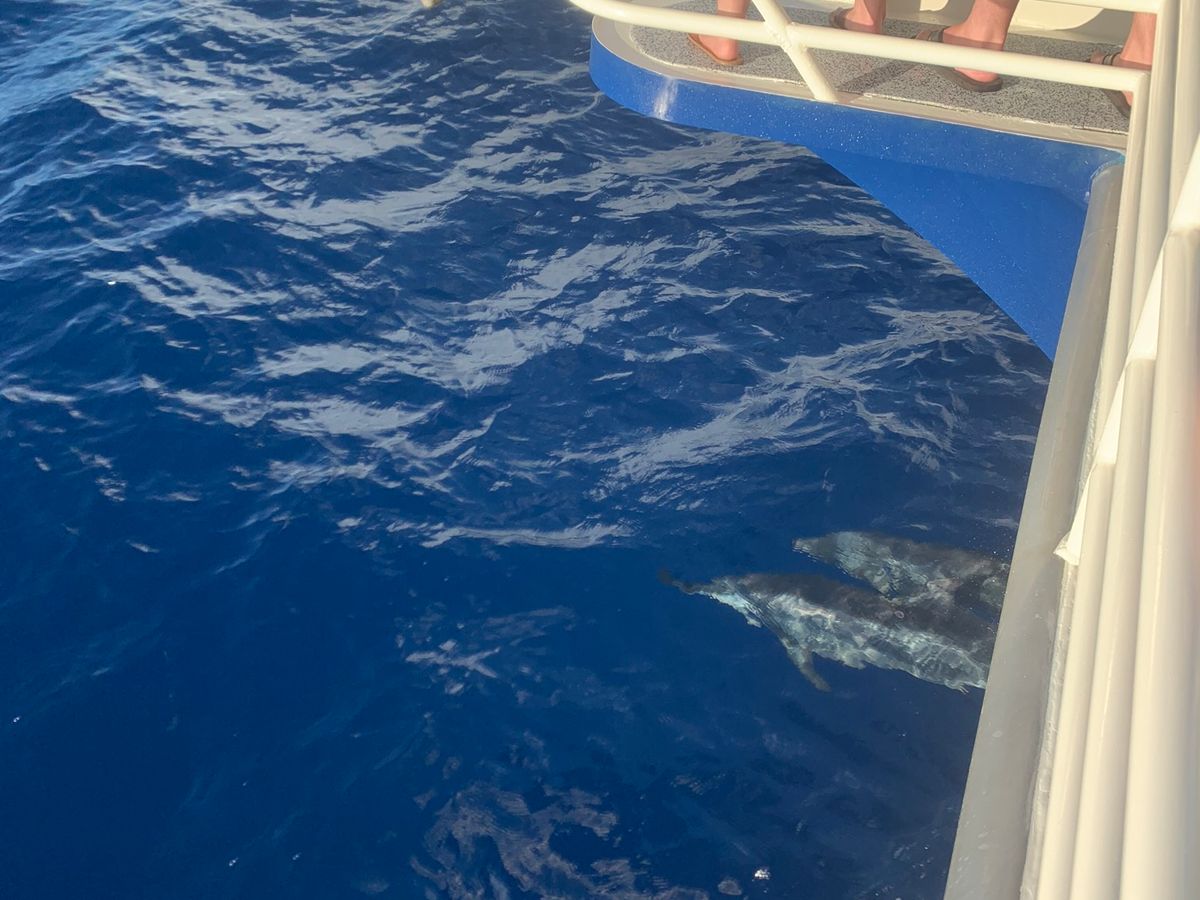 送迎なしのため、船着き場まではuberで$20で行きました。4人で申し込んだところ、船に乗るのは私達だけでした。他の参加者【全員英語圏】も家族ごとに別の船だったようです。ブロウホールを見学したあと、キャプテンクック岬でシュノーケリングしました。たくさんの熱帯魚が見られます。そのあとイルカを探しに行き、キャプテンホエールという体長5mの大きなイルカの群れに遭遇できました!イルカは船上からの観察です。