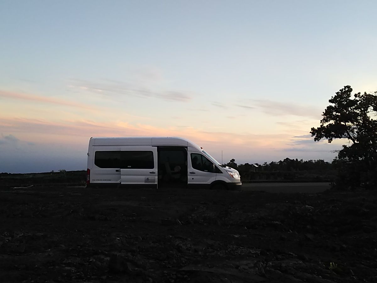 14人乗りのベンツのバスでハワイ島を四分の三周くらいするツアーで、総走行距離は500kmくらいみたいです。30〜1.5時間くらいずつバスで走ってポイントを回っていきます。