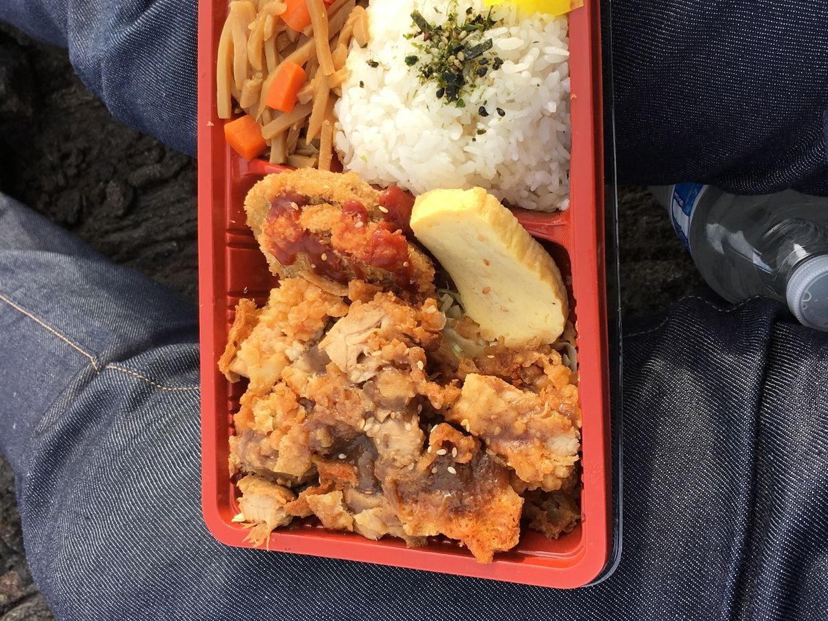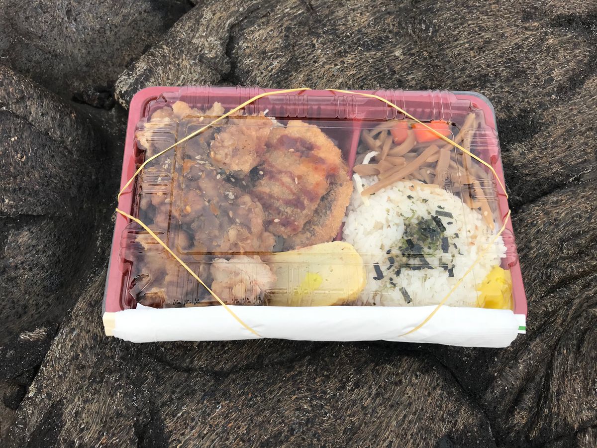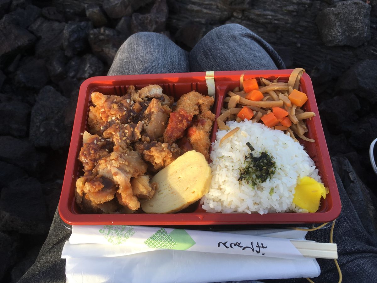 雨がぱらついた時もありましたが、ハワイの天気はすぐ変わるということで、無事溶岩台地でご飯を食べることができました。このお弁当が、日本食のごく普通のお弁当なんですが、すごく美味しい!笑