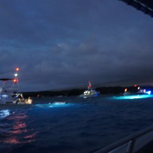 ホノウコウハーバーに到着し、日本人には日本人ガイドさんより説明を受け、初めてのウェットスーツを着てシュノーケリングを付けました。いよいよ始まるって感じでワクワクです。外人観光客も含め約20名の参加者です。ウェットスーツ姿の写真を撮り合ってます。いよいよ出航です。途中、夕陽が沈んだ後の景色を見ながらの航行です。船は荒波を蹴り、急降下、急上昇あり、皆は笑いを伴う悲鳴?を発してます。まるでジェットコースターの気分。ポイントに着くと十数隻の船が既にライトを照らしマンタを狙っています。私たちの船長は慎重に船を進め他の船の様子を伺い連絡を取リあってマンタの情報を得ています。どうも本日はマンタの数も大変少なく波も荒い為、私たちが海に浸かることにより疲れが生じることから中止、帰港となりました。