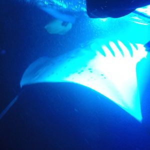 夕日が沈み、暮れなずんでいく空を見つめながらマンタ君との出会いの時間を待つ。空港の明かりを遠目に海に入り、サーフボードに設置されたバーをつかんで海を除いていると… 昇ってくる、昇ってくる、マンタ君が何匹も!大きな口を広げて、手を伸ばせば届きそうなところまで昇ってくるマンタ君たちに感激!!夜の海は初体験でしたが、最高でした☺