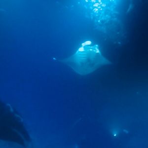 船の停泊ポイント到着後、船から降り海の中でプカプカ浮きながらマンタがよく見えそうなポイントまでイントラクターが浮き輪?(サーフボードを2つくっつけたもののようなモノ)を引っ張って移動。しばらく待っているとマンタがわれわれの目の前に登場し宙返りする姿を見せてくれました。暗い夜の海の中、プランクトンを集めるための青いライトに照らされるマンタはとても美しく心が洗われました。(マリンスポーツ初心者だからでしょうか)