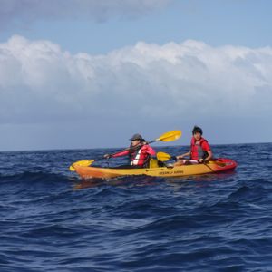 シーカヤックは基本一艇に二人で乗ります。それなりのスピードでトータル4マイルほど漕ぐので非力な女性などはそれなりに疲れると思います。