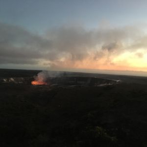 夕暮れと共に噴煙が徐々に赤く浮かび上がってくるキラウエア火山に一同興奮が高まりました。夕暮れと共に気温はかなり下がりますが、ダウンジャケットを貸してもらえたので全く問題ありませんでした。寒さについては、昼間の溶岩台地等観光用に羽織れるものを1枚持参すればいいと思います。