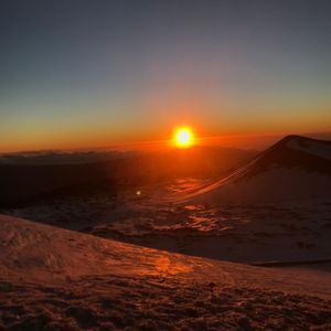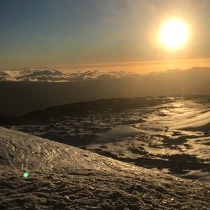 雪が残る山頂。手前に見えるのは雪で、その奥が雲海です。雲海に沈んでいく太陽と夕陽。言葉では言い現せない感動です。地球の大きさと生命力を感じました。ガイドさんが素晴らしい夕陽の写真を撮って下さいます