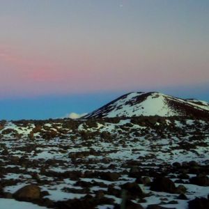 風もとても強かったですが、4200メートルからの雲海や夕日が沈んでいく景色は、別世界にいるようで、寒さも忘れて見入ってしまいました。雪のあるマウナケアは、いまの時期だけだと聞いて、胸がいっぱいになりました。高山病がちょっと心配でしたが、「走らないように」とのガイドさんの指示を守ったら、当日の参加者11人全員元気でした。気温も下がり、路面凍結とのことで、残念ながら星空観察は2800メートルまで下りて行いました。スキーウエアを借りていても、4200メートルでは指がかじかんでいましたが、2800メートルまで下がると寒さを感じませんでした。金星と半月を望遠鏡で見せていただき、そのあとは市川さんの星空解説会。遠くまではっきり示せる性能バツグンのレーザーポインターを使って、東西南北に見える星と星座をとてもわかりやすく、楽しく教えてくれました。市川さんの星の知識の深さにビックリでした。日本ではよく見えないオリオンの剣まではっきり見え、嬉しくなりました。夜中には、南十字星も見えるそうです。大満足のツアーです。参加できて本当に良かったです。ハワイ島に行ったら、絶対マウナケアおすすめです。