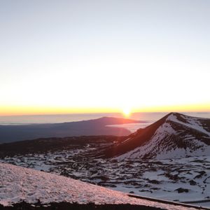 初めて4000m超の山に登ること、山の上はとても過酷な環境と聞いていたこともあり、不安がありましたが、ガイドの方のきめ細やかな心配りのお陰で、誰も体調を崩すことなく、参加することができました。やはり、山のことを知り尽くしているガイドさんと行くのが安心だなぁと思いました。残念ながら今回は悪天候のため、頂上では夕陽は見られませんでしたが、少し降りたところで夕焼けの絶景を見られましたし、自然の威力を体感する機会にもなりました。雪景色のマウナケア山はとても珍しいそうなので、逆にラッキーだったのかもしれません。星空はまさに天然のプラネタリウムで、面白い星座解説と共に、いつまで眺めていても飽きることがなく、思い出に残る風景となりました。ネイチャースクールの皆さま、ありがとうございました!