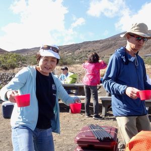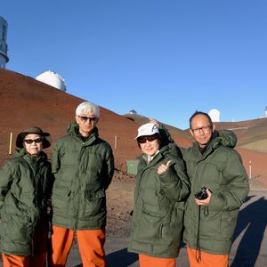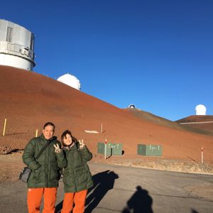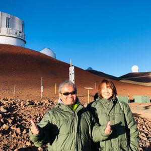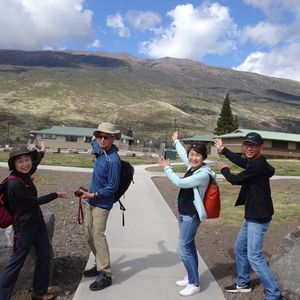 今回友人夫婦とシニア4人で参加しました。 1年半前のハワイ島(12月)では現地で申し込みするも、前日の大雨で中止になり参加できませんでした。 その代わり積雪のある白いマウナケア(まさに白い山)を拝めましたが... 今回は事前に余裕をみて、ハワイ島到着日の翌日に予約を入れました。ところが当日わざわざバスで宿泊地まで来ていただき「強風のため山頂は閉鎖」と伝えられたことから、その場でスケジュール確認し、2日後の4月3日に予約を変更することができました。 予約当日ガイドのシンさんがお迎えにきて、今回はケアウホウ地区のみでバスが一杯(11人)になったため時間に余裕がありました。 登る途中では雲の中で雨も少し降りましたが、2000mのマウナケアパーク、2800mのビジターセンター、4200mの山頂でも天候ばっちりで素晴らしいサンセットが見られました。 2800mのビジターセンターのベンチで食べるお弁当も、シンさんが言うほど(??)でもなく、お味噌汁は確かにおいしく、同行したバスのガイド松崎さんのハイテンションも楽しかったです。 ビジターセンターからしばらくオフロードがあり、バスの後部座席は跳ねてはねてギャハギャハと盛り上がっていました。 山頂付近に登りスバル天文台が見えると超テンションがあがります。 山頂では日没後は30分以内に降りなければならないようで、星を見られる3800mの駐車スペースまで下ります。 そこで見た星空は感動としか言いようがないものでした。 最初は太陽の光が残っていますが、徐々に暗くなり見える星も増えてきます。 流れ星も4回見ることができました。 シンさんの星座の説明素晴らしかったです。 望遠鏡でオリオンの大星雲を見せてもらいました。 それから星空をバックに記念撮影もしてもらい、後でその他の写真と一緒にダウンロードできます。 行きは3800mあたりから空気の薄さを感じ、山頂で靴下をはこうと頭を下げたらクラッときましたが、自力での登山中のようにあきらかな酸素不足を感じることも、高山病の症状も無く無事戻ってこられました。 最高の機会に恵まれ、楽〜に4200mまで登り、満天(まさに!)の星空を見られるツアー、また参加したいです。 天候次第ですが、おすすめです。 是非チャレンジしてください。