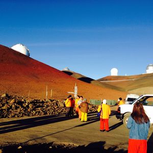ハワイ島のマウナケアは、4205mと、富士山より高いにもかかわらず、車で容易に行くことができ、日本のすばる天文台や、きれいな星空がみられ ると言うことで、このツアーに参加しました。他に何社か催行していますが、マサシネイチャースクールさんは、写真を撮ってくれた上、さらにHPか らダウンロードが可能ということで、こちらを選びました。簡単なスケジュールとしては、13:30カイルアコナ出発 14:30 ワイコロア出 発、パーカー牧場の間を抜け、16:00オニヅカビジターセンター着(夕食のお弁当と絶滅危惧種である銀剣草の鑑賞),貸していただける防寒着を 着用して17:15センター出発、途中、となりの4000m級のマウナロアや、すばる天文台をバックに写真を撮りながら18:15山頂到着。 18:45サンセット19:15山頂出発。3600m位まで降りて星空観測(望遠鏡で木星と月の観測、ガイドさんの星座解説、写真撮 影)21:00オニヅカビジターセンター出発 22:00ワイコロア22:45カイルアコナ着。