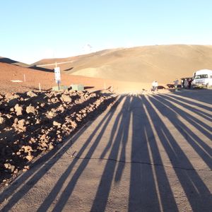 途中トイレ休憩をはさんだりしながらまずはマウナケア中腹のオニヅカビジターセンターへ。ここでは望遠鏡が常設されていて、他の観光客と一緒に望遠鏡をのぞき込み、太陽の黒点やフレアを見ました。山頂で夕日を見るためにこの場所で思いっきり早めの夕食(時刻はまだ4時半頃)。この地点で既に寒かったので、お弁当の他に温かいお味噌汁は嬉しいサービスでした。高度に身体を慣れさせるためしばらく滞在し、スキーウエアのような派手な防寒着のズボンもこの場で着用。標高4000メートルを超える高地に突然行くと、ズボンをはくような動作だけでも血液が脳に回らなくなり、脳が低酸素状態になる危険性があるからだそうです。私自身、日本の高原に行っただけでも頭痛やめまい、吐き気に襲われることも多く、高山病が怖かったので、ガイドさんの指示に従って眠らないようにしたり、深呼吸をして浅い呼吸にならないよう気を付けたりしました。舗装されていない凸凹道もあったものの、心配した吐き気や頭痛に襲われることもなくあっという間に山頂に到着。辺りは明るいけれど間もなく夕日が沈む時刻です。