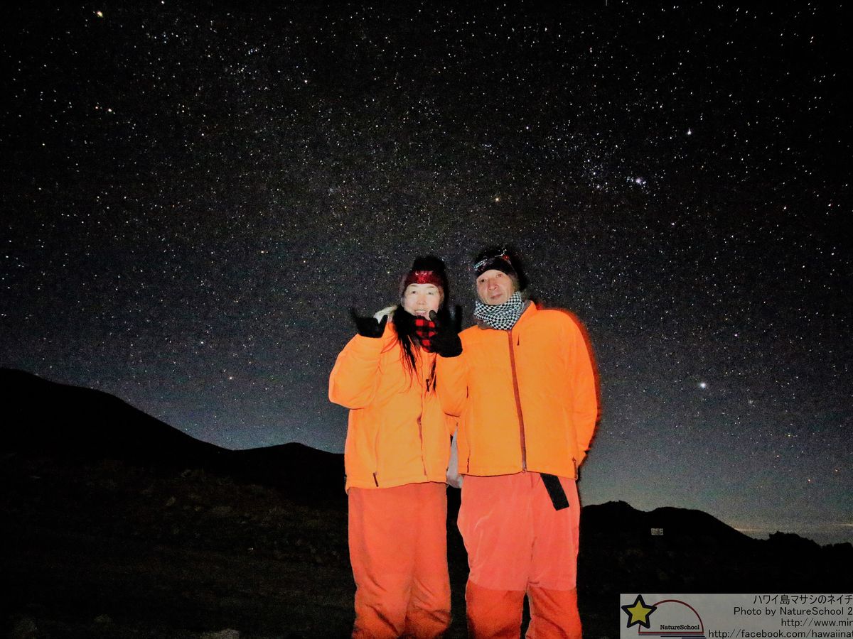 今年は娘を連れてきて、マウナケアケア山頂サンセットと星空観察は是非見せたかったものでした。マサシネイチャースクールさんは、上下防寒着と帽子、手袋まで貸してくださった上、お弁当や味噌汁も美味しく、食後のココアもとても美味しかった。サンセットは綺麗で、星空観察の説明もわかりやすく、紅茶とクッキーのサービスがあり、寒い中あったかいものがとても嬉しかった。昨年他のツアーで参加した時は、防寒着は上だけしか貸してくれず、それも山頂に着いてからだったので、寒くて高山病にかかってしまった経験のある私には、至れり尽くせりのサービスで、松っちゃんのノリのいい説明と写真撮影の技術にとても感謝しています。娘も大満足していました。ミルキーウエイには感動しました。これからは、マサシネイチャースクールにお願いしたいと思います。