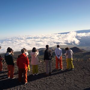 2月29日のマウナケア夕日・星空ツアーに参加しました。14時45分に宿泊していたマリオットワイコロアリゾートに迎えに来て頂き、近隣ホテルの方と共に出発。ガイドさんが道中も景色の説明やハワイ島の歴史等をして下さり楽しく和気藹々とした車内でした。途中停車し、溶岩が流れ固まった地層付近で写真撮影をした後オニヅカビジターセンターへ。オニヅカビジターセンターでは、お弁当、おみそしる、暖かいお茶をいただきました。日々アメリカンフードで飽き始めていたため、白いご飯とおみそしるがありがたかったです。一時間少々休憩ののち、いざ山頂へ。この日は山頂の気温は8度程度と冬にしては異常な暖かさだったようですが、それでも長時間いるにはとても寒かったので、より長く外で楽しむためにも厚着をオススメします。山頂眼下に広がる雲海、雲海の中に沈んでゆく夕日、はとにかく圧巻でした。日が沈み星空観察ポイントへ。満点の星空のもと、ガイドさんが丁寧に星空解説をして楽しませて下さりました。