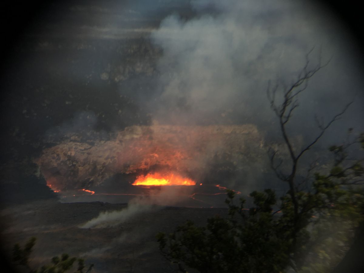 辛うじて一瞬雲の合間から夕陽、遠くにキラウエアのマグマが。