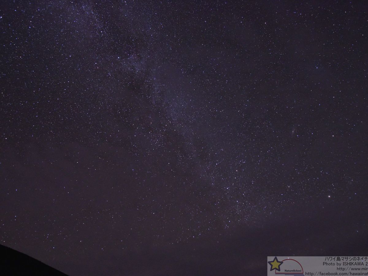 星空観賞の場所。マウナケア山頂からオニヅカセンターへの途中の脇道で停車し説明会が始まりましたが、すぐ近くを下山する車が何台も通るので砂煙が巻き上がるし、私は一眼レフでの撮影に挑戦していたので、車のヘッドライドの明かりが邪魔して何枚も撮影に失敗しました。しかも山間でひらけた場所ではないので、山が邪魔で星空が隠れてしまい台無しです。観賞場所ならもっと他にもあるはずです。