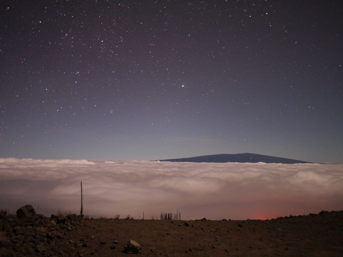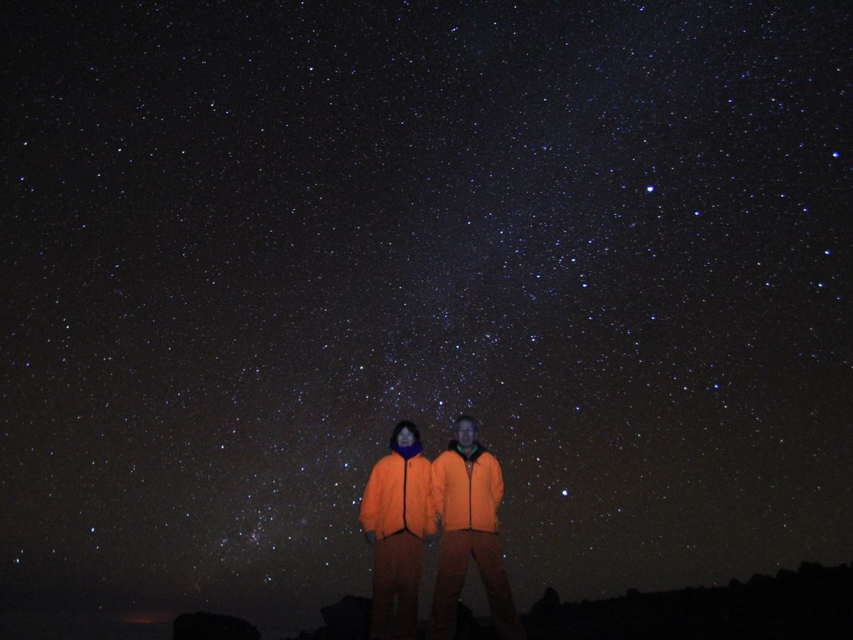 目の前にはオリオン座、天の川や南十字もはっきりと見えます。うっすらと赤くキラウエアの火口の明かりも見えます。