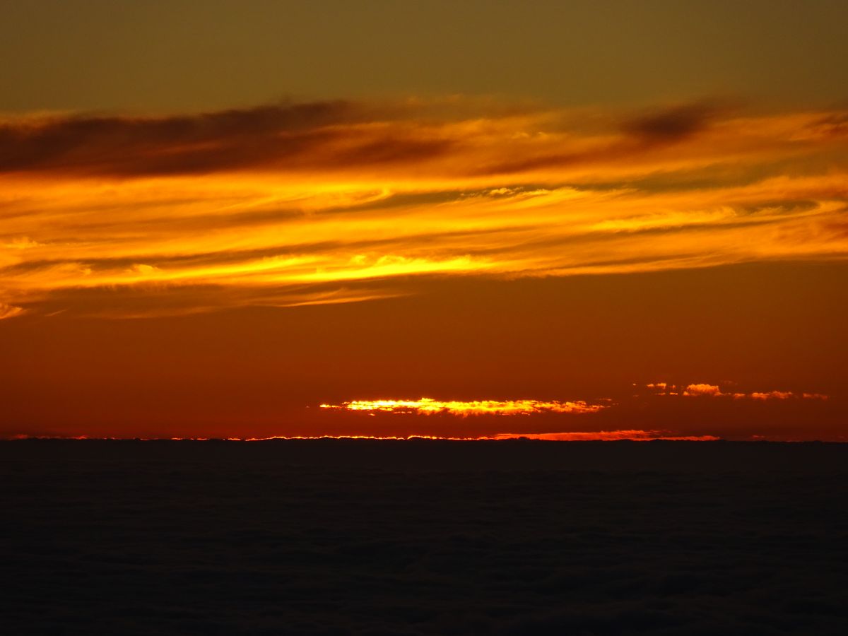強風の中でしたが、雲海の下に見える海(!)に夕日が映って、素晴らしい夕日でした。