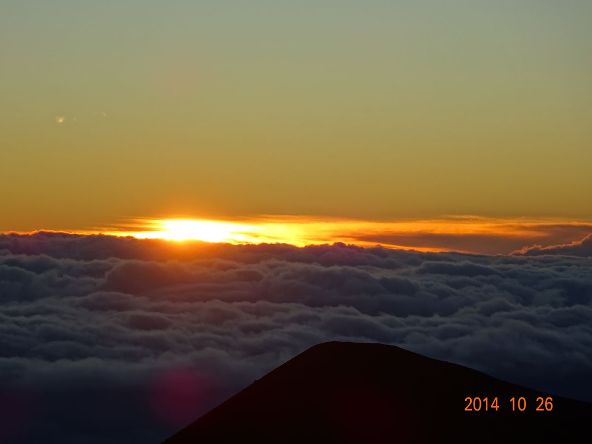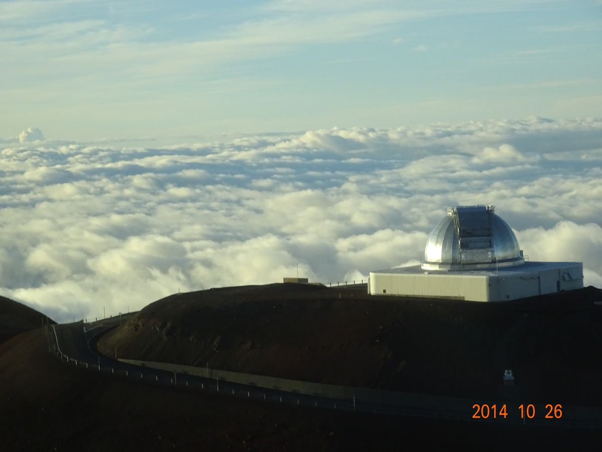 当日は高層に雲がかかり、雲海に沈む綺麗な夕日とはいきませんでしたが、雲海の向こうにマウナロア、ハレアカラを望め、凛としたスバルの雄姿、刻々と変わる空と雲の色、一瞬輝きを放つ夕日に感動しました。 また土星を初め満点の星を楽しむことが出来ました。