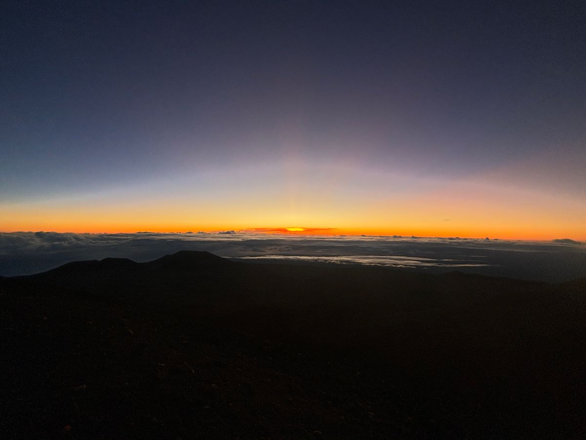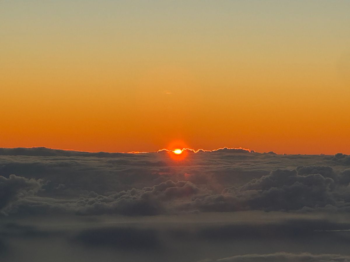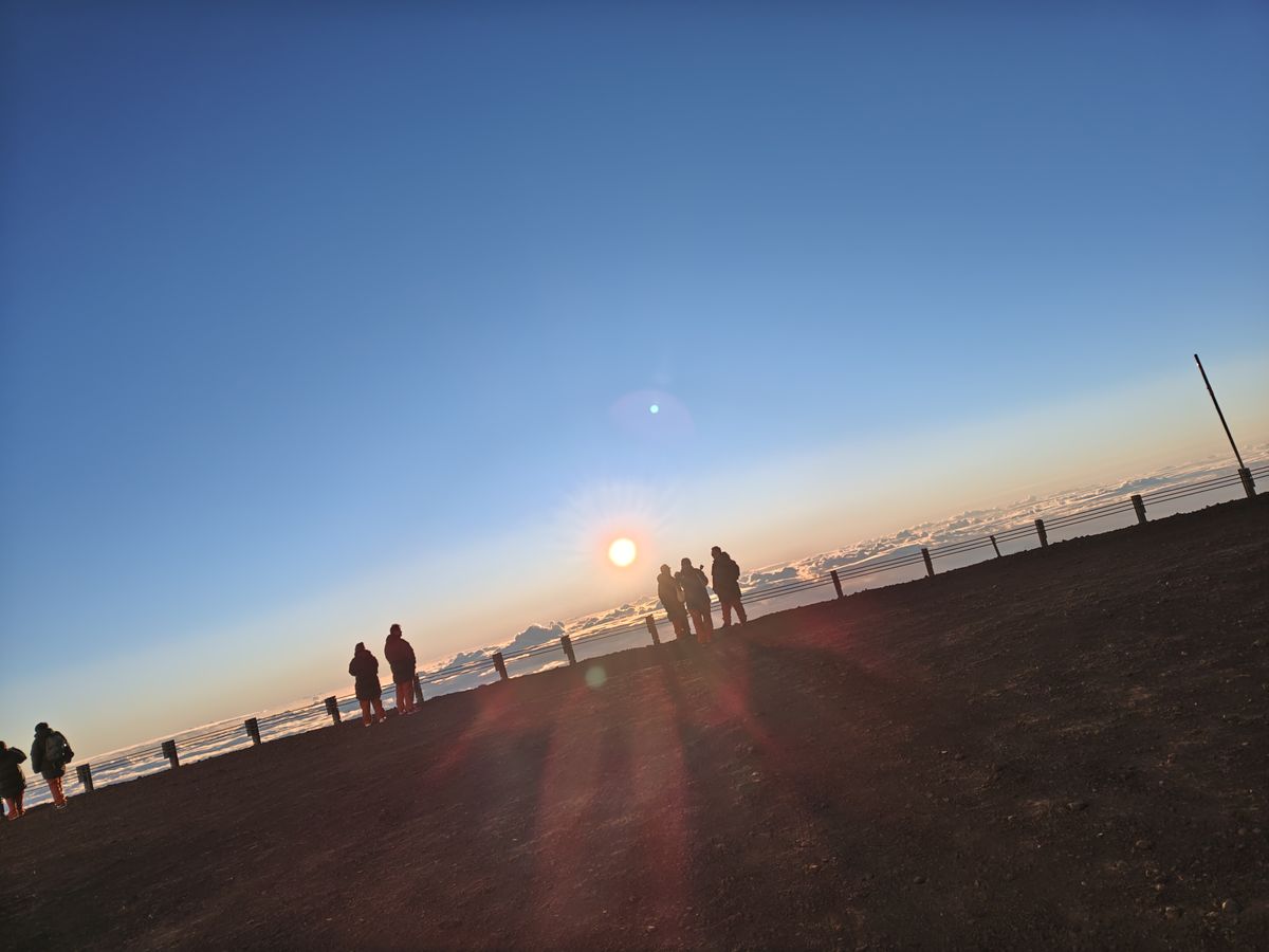 体を高所に慣らした後はマウナケア山頂に向かいます。山頂の気温は4度程度で風も強くなくて貸与してくれるダウンジャケットとスキー用パンツで寒さをしのぐことができました。山頂から望むご来光は息を呑むほどの美しさです。