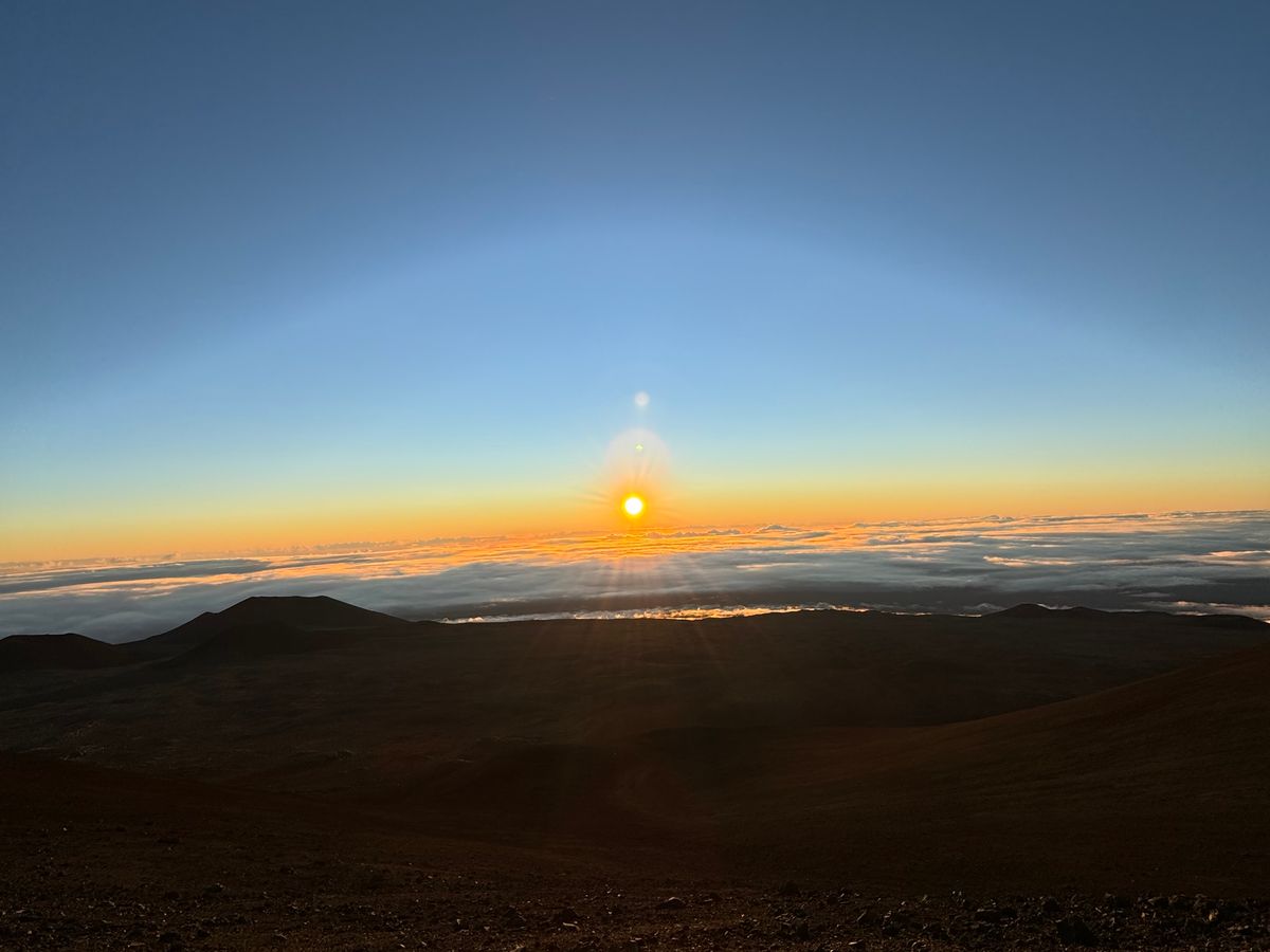 レーザーポインターを使った星空観測はとてもわかりやすく、大変貴重な体験でした。朝日はだれもが息を呑み無言。夜が明けてから朝日と反対側の虹色に広がるビーナスベルトも美しかった。マウナロアの全貌も見られ、なぞのぽこぽこした山についても教えていただけ大満足。