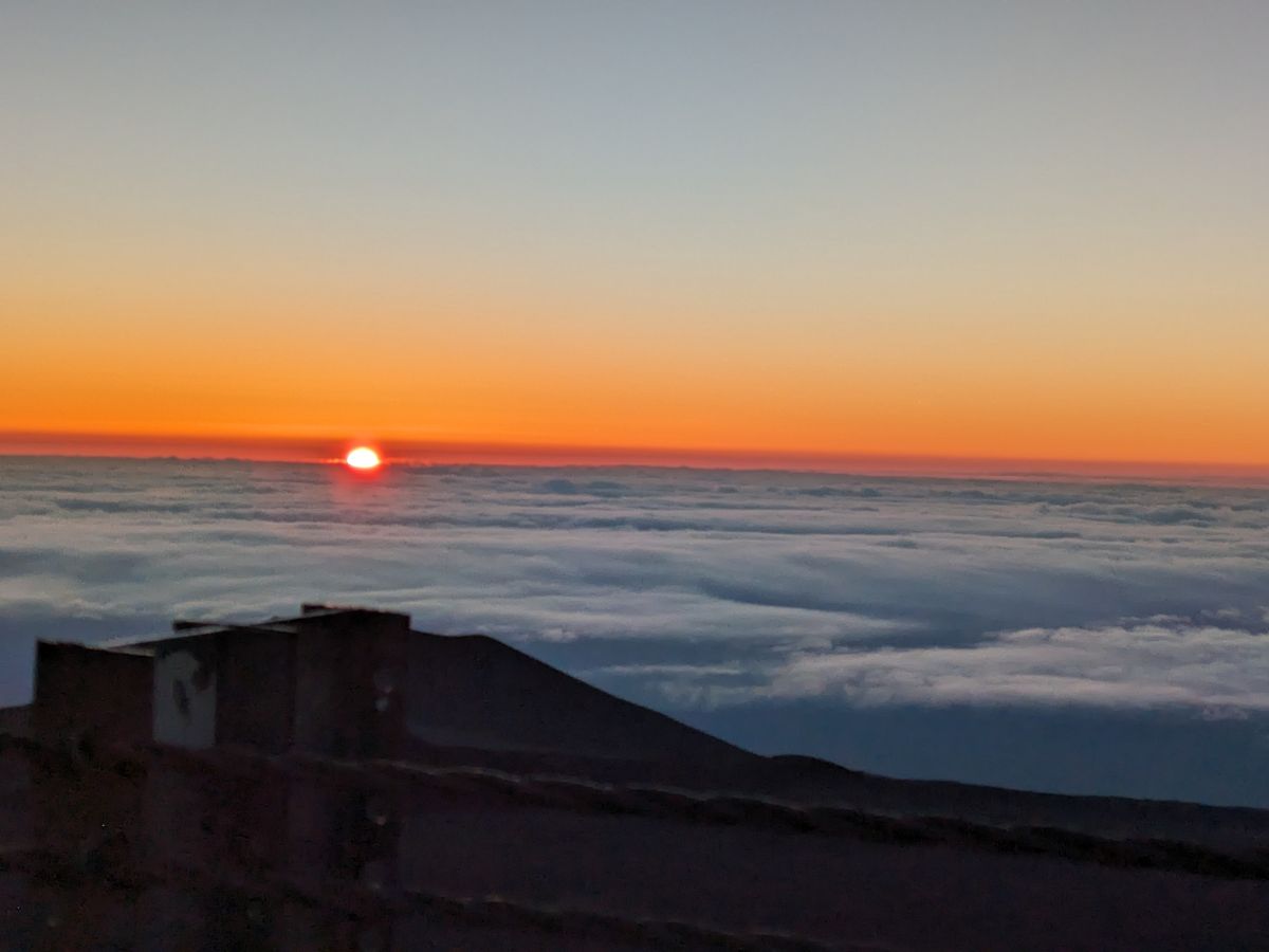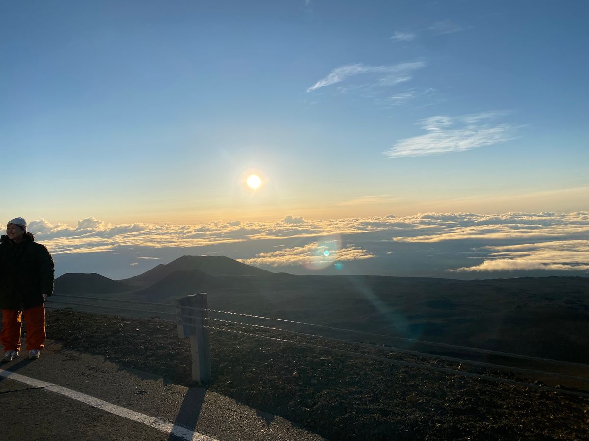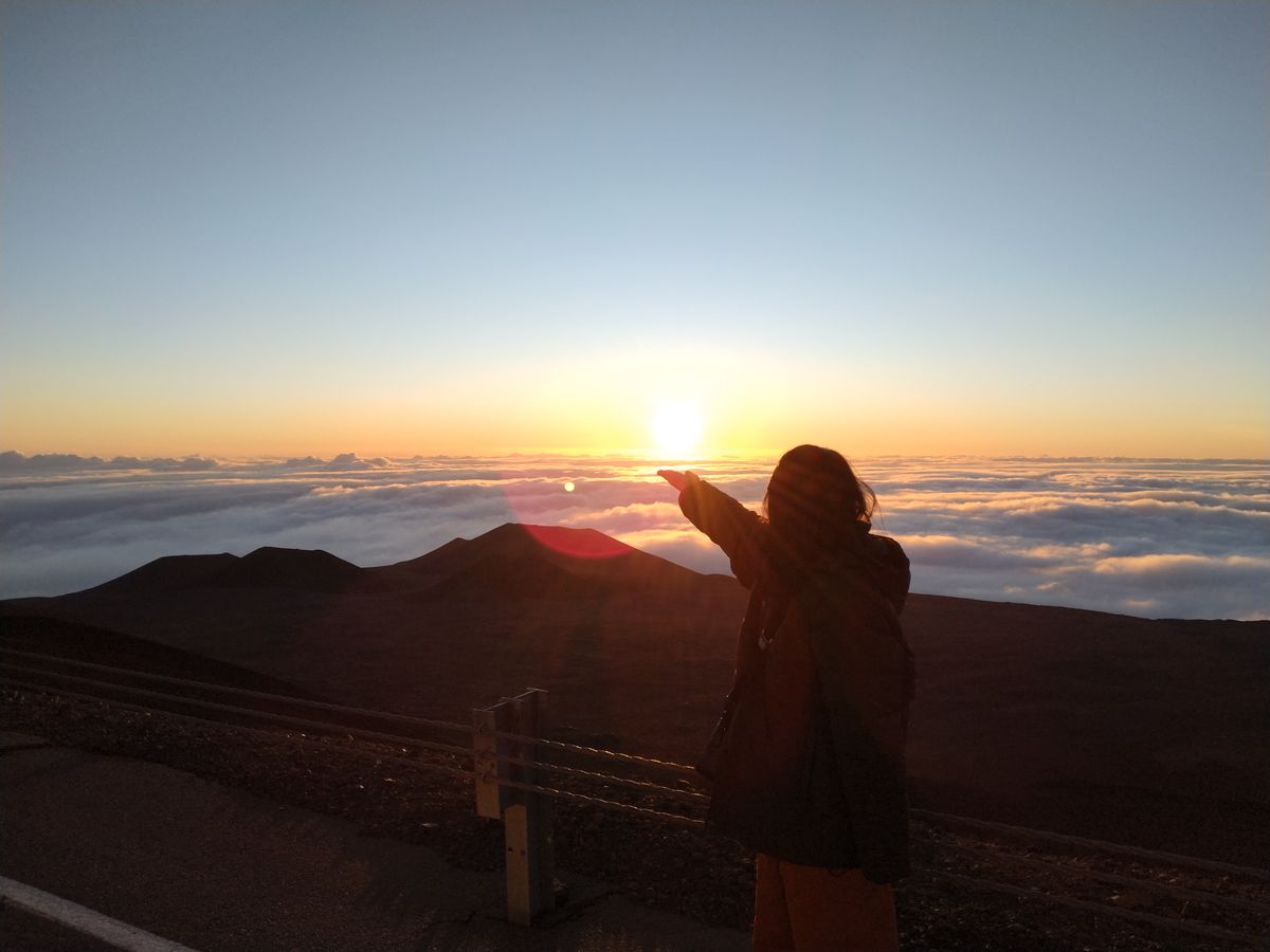 いよいよ山頂です。頂上まで舗装道路が続いているので、クルマから降りたら日の出前の雲海が青白く広がります。太陽が登るところから朝焼けがオレンジ色に雲海を照らし、その左手と反対側には望遠鏡が、右手にはマウナケアの聖なる山頂が見えます。気持ちがはやりますが、酸素濃度は麓の 80 %。高山病の症状であるふらつきや手足のしびれがあるはずなので、急に歩き回らず落ち着きましょう。気温はオニヅカ・センターより温かい 4 ℃と言えど寒いので、高山病の症状緩和と寒さ対策を兼ねながら歩き、自由に鑑賞と写真撮影をしましょう。ガイドさんも様々な写真を撮ってくれます。その間に太陽の頭が雲海から出はじめ、辺りをオレンジ色の朝日で眩しく照らします。太陽が少しずつ登る様子に見惚れていると、雲海から思ったより早く登り出てしまいます。しかしながらその動きは、星空鑑賞のときと同じく、大地と宇宙を感じられ、ハワイ島に来た甲斐があったなと感じられます。