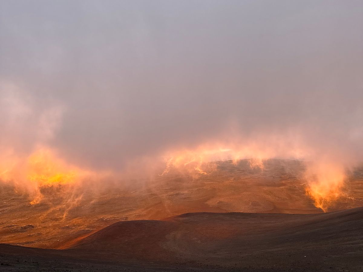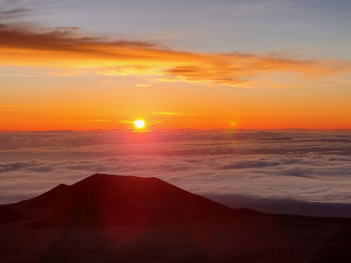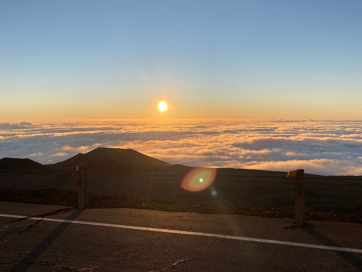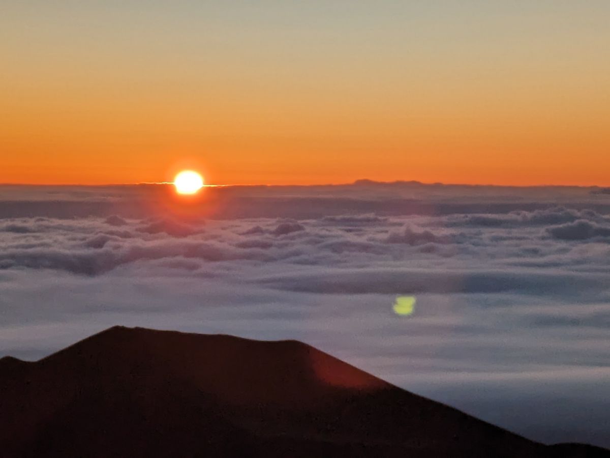 いよいよ山頂です。頂上まで舗装道路が続いているので、クルマから降りたら日の出前の雲海が青白く広がります。太陽が登るところから朝焼けがオレンジ色に雲海を照らし、その左手と反対側には望遠鏡が、右手にはマウナケアの聖なる山頂が見えます。気持ちがはやりますが、酸素濃度は麓の 80 %。高山病の症状であるふらつきや手足のしびれがあるはずなので、急に歩き回らず落ち着きましょう。気温はオニヅカ・センターより温かい 4 ℃と言えど寒いので、高山病の症状緩和と寒さ対策を兼ねながら歩き、自由に鑑賞と写真撮影をしましょう。ガイドさんも様々な写真を撮ってくれます。その間に太陽の頭が雲海から出はじめ、辺りをオレンジ色の朝日で眩しく照らします。太陽が少しずつ登る様子に見惚れていると、雲海から思ったより早く登り出てしまいます。しかしながらその動きは、星空鑑賞のときと同じく、大地と宇宙を感じられ、ハワイ島に来た甲斐があったなと感じられます。