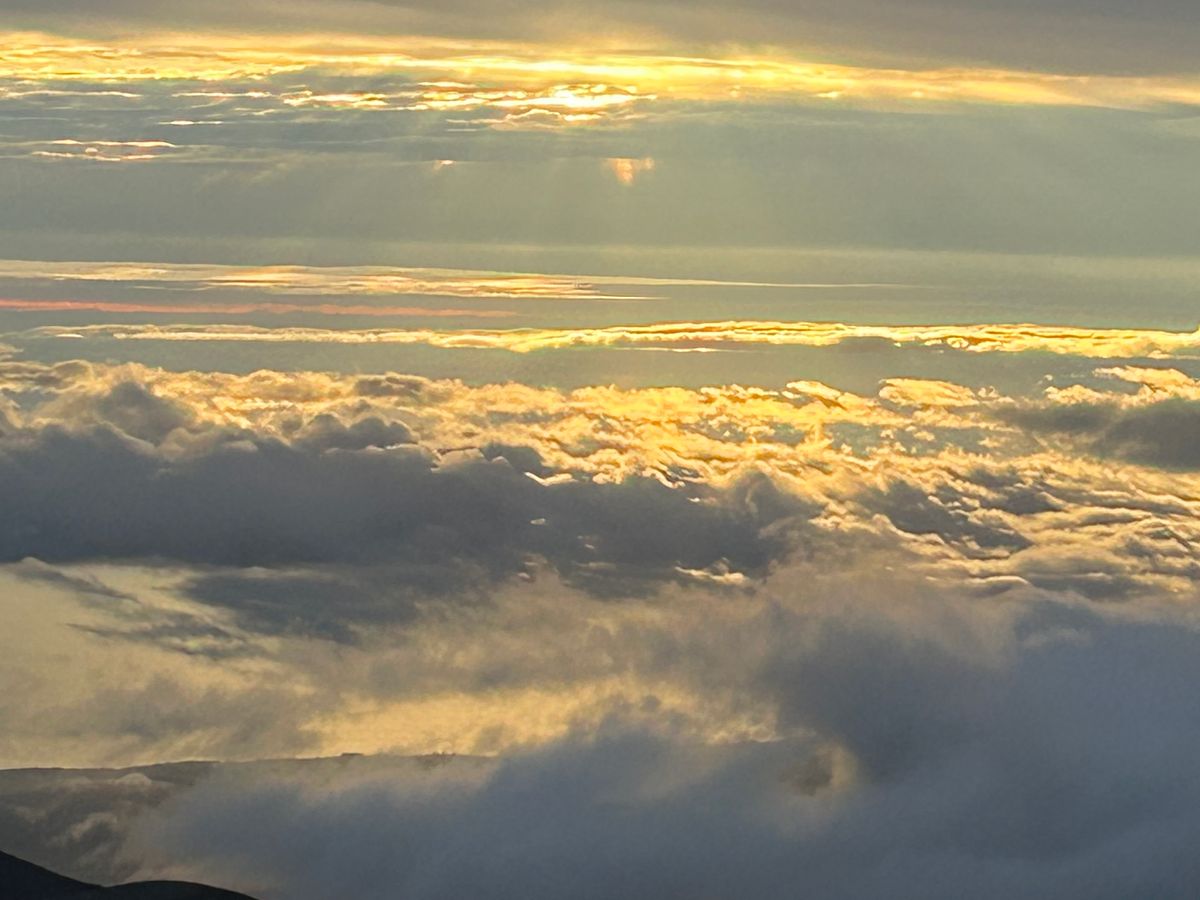 オニズカ・ビジターズセンターを過ぎたあたりから徐々に良い状態になり、最高のサンライズになりました。スバル天文台のあたりでバスが止まって降りた人からことごとく「おーーっ」と声があり、私も同じ様に不覚にも「おーーっ」と言ってしまいました。本当は違う反応がしたかったのに!雲の上に徐々に太陽が登る様に圧倒されました。ありがとうマウナケア「ペレ様」でした。