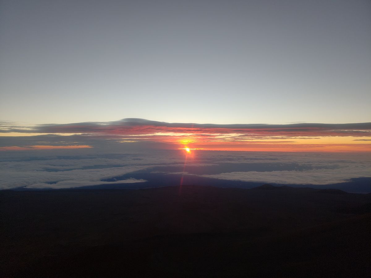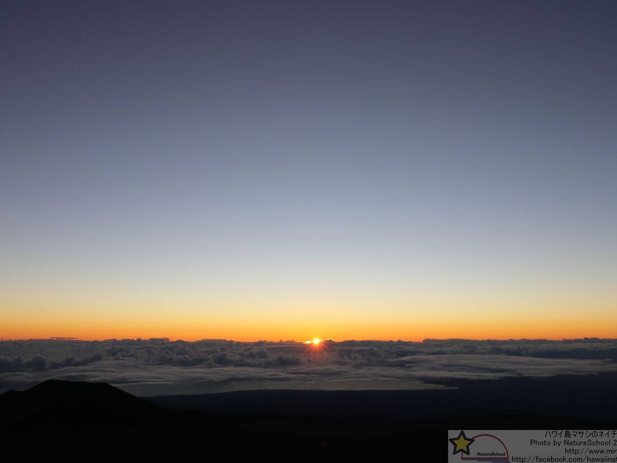 日が昇り始めるまぎわの西側、ちょうど日本の天文観測所である「すばる」の上あたりに太陽に照らされてできたマウナケア山の影が薄いピンクに染まった空に映り「わぁー」っと思っていると反対側の東の雲海を真っ赤に染めながら太陽があがってきました!