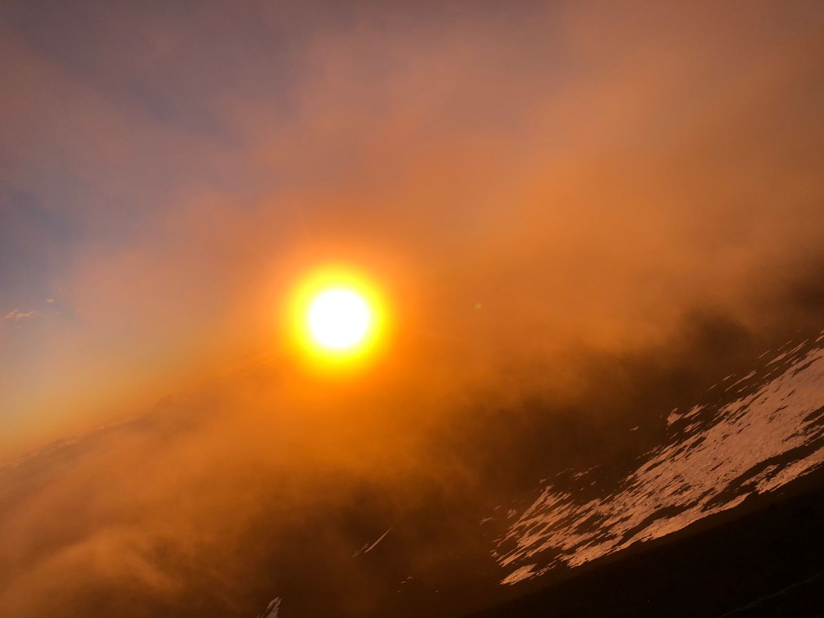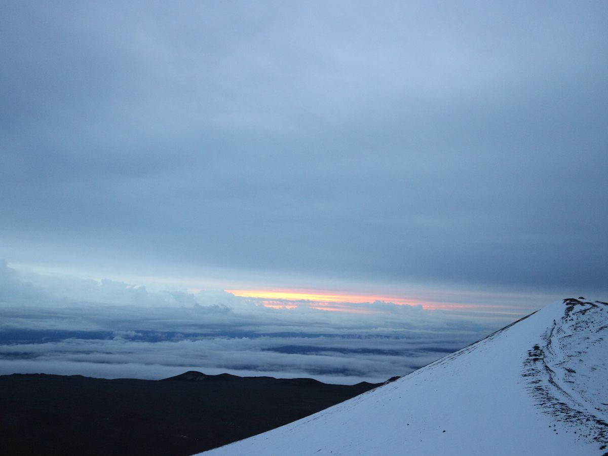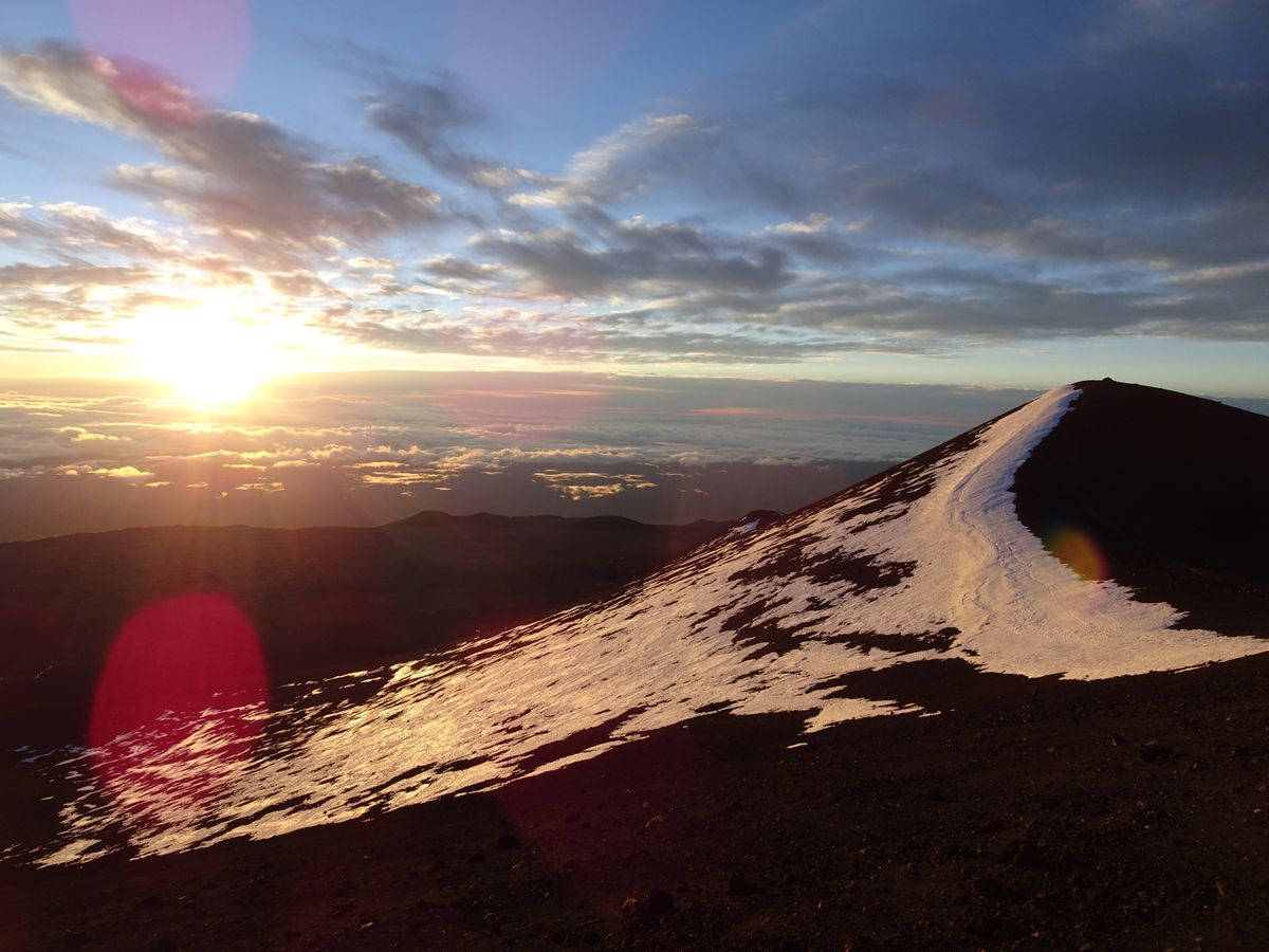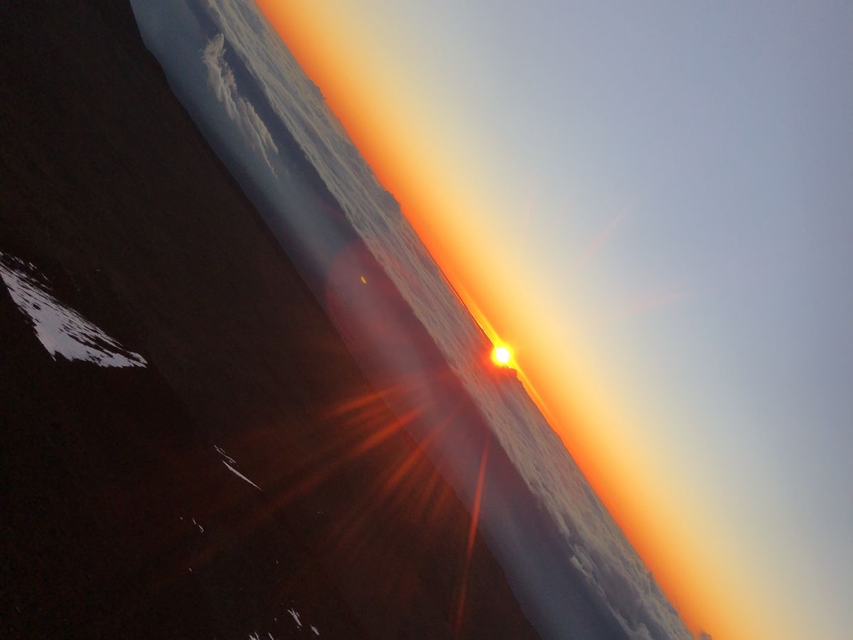 そして1か月ぶりにゲートが開いていて、山頂へ。ラッキーでした。この時期はオニズカまでの日が多いそうです。雪の残る山肌と初めて見る日の出。本当に綺麗でした!天気が良かったので裏マウナケアもバッチリ見えました。