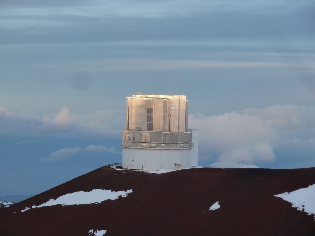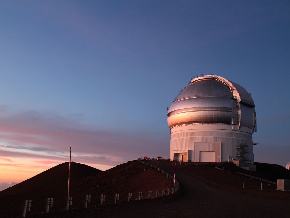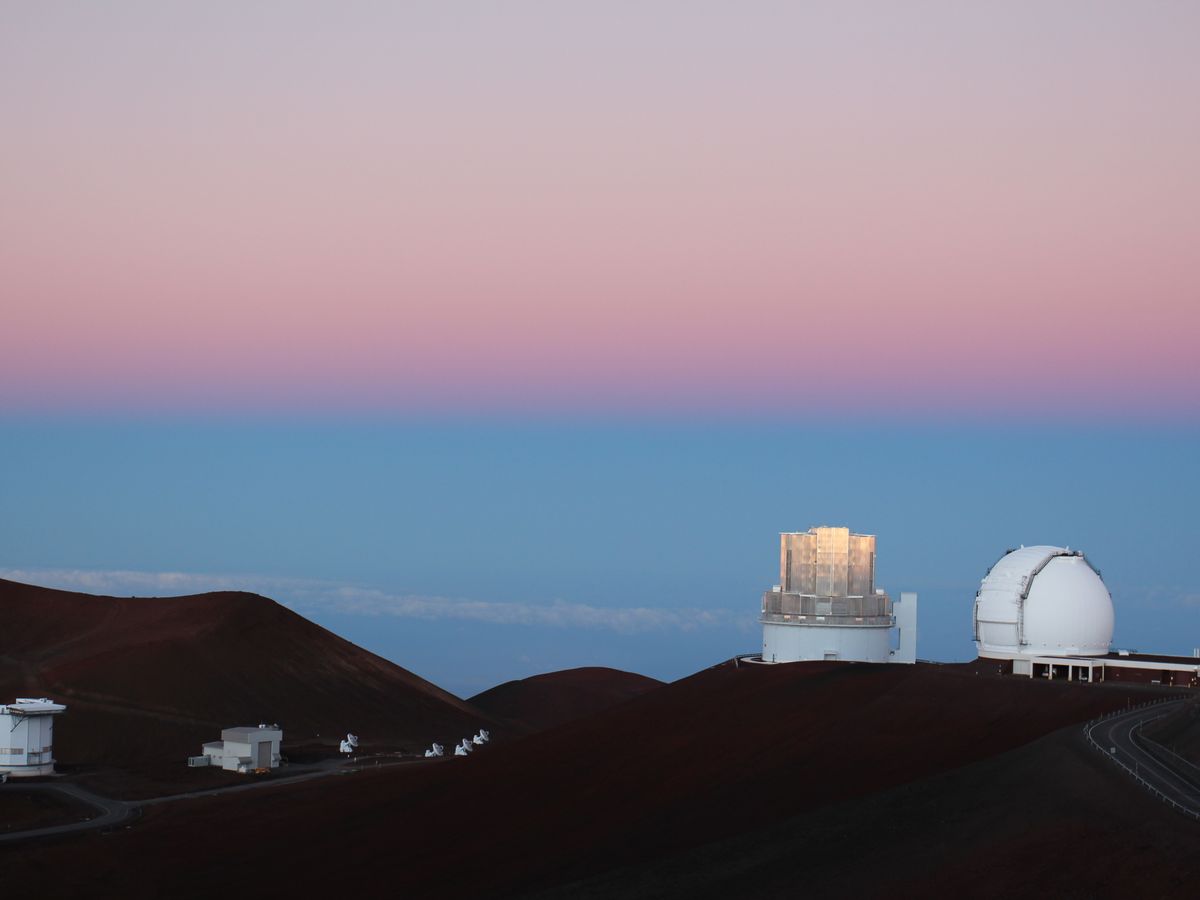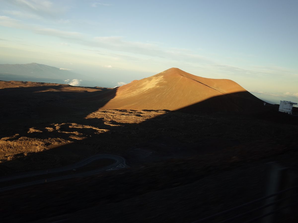 朝日に輝く日本のすばる望遠鏡や大地に映るマウナ・ケアの山影や