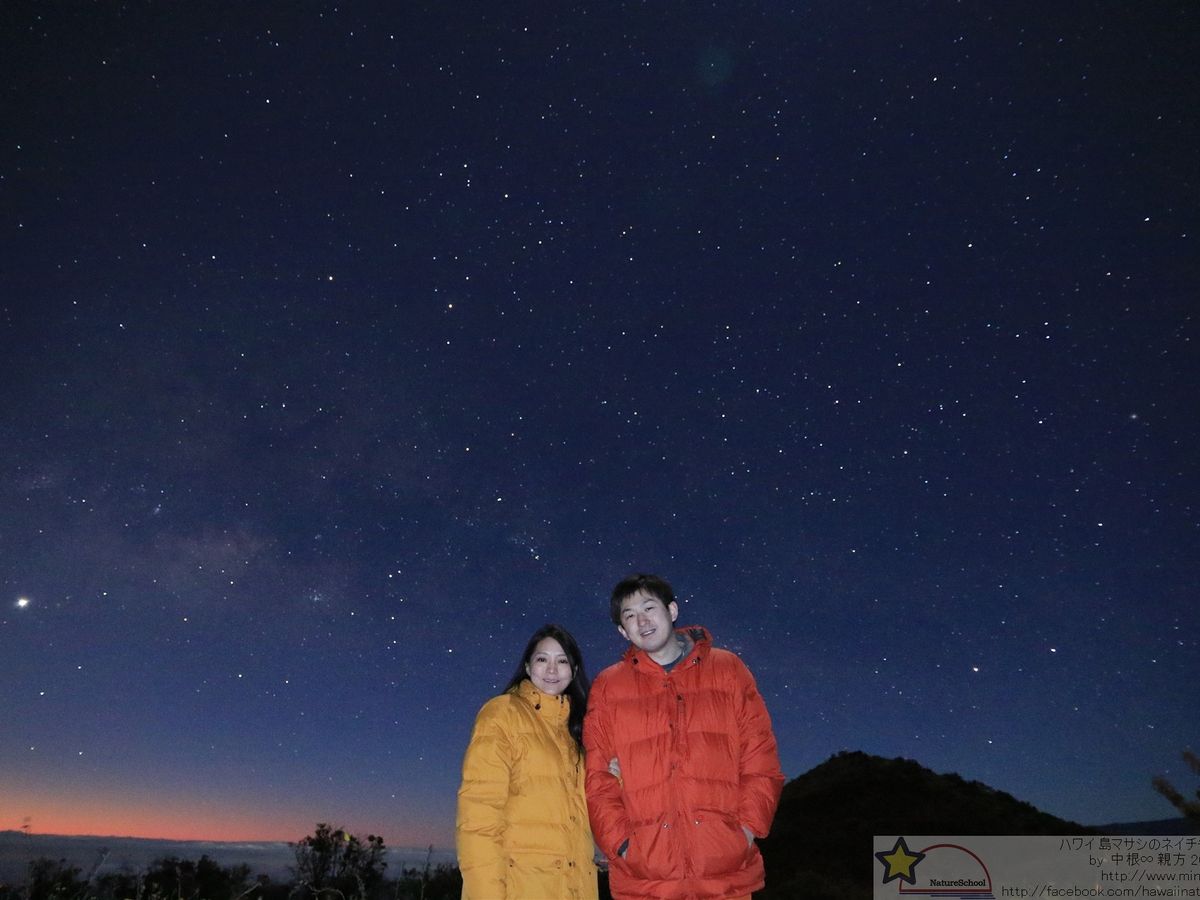 ハワイ島到着の翌日のツアー予約でしたがマサシネイチャースクールから連絡を頂き当日は山頂の風が強そうなので1日延期した方が良いと言われ翌日に変更してもらいました。幸運にも翌日は風も無くおだやかで絶好のツアー日和になり降るような星空とガイドの専門的な解説で大満足。カメラを持っていなくてもガイドさんのプロ的テクニックで星空バックに記念写真を撮ってくれます。何処かの観光地のように1枚いくらなんてケチなことは言いません。無料でリクエストにも気軽に応じてくれます。星空バックに記念写真なんて素人では取れませんからね?これだけでも充分満足ですが肉眼で木星と土星を見せてくれました。さらに30年に1度、しかもこの時だけしか見れない5つの惑星が一直線に見える時期と合わさりラッキーでした。オニヅカセンターで飲ませてもらったあったか~いココアが美味かった。ここから山頂までは未舗装道路を4駆で一気に駆け上がり空が明るくなり始めたころ到着です。そして日の出です。ここでも思い思いのポーズで記念写真を撮ってくれます。ここでしか見られない朝日による山の影や日の出直前のアルペングローなど感動の時間がアッという間に流れた一晩でした。このアクティビティーは間違いなしで100%満足します。