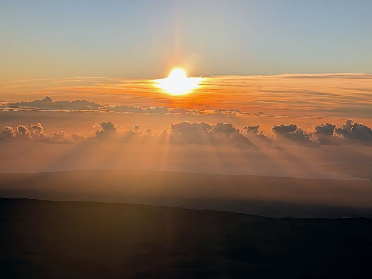そして夜明け、山頂で迎えたサンライズは、まさに息をのむ絶景でした。眼下に広がる雲海に太陽の光が差し込み、幻想的な光景が目の前に広がります。それは、神々が住まう聖域にいるかのような、神聖で貴重な時間でした。