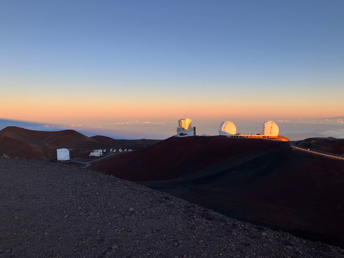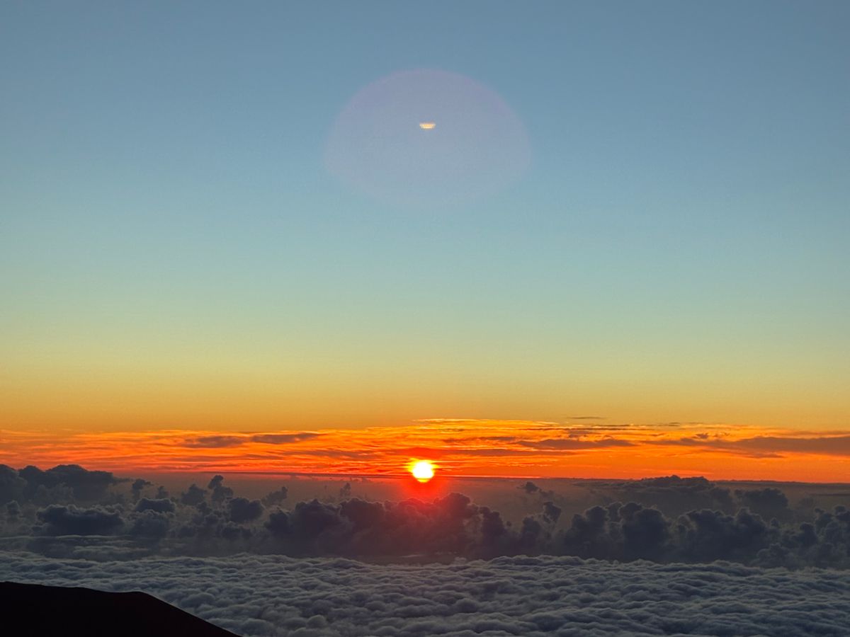 そんな気持ちを察したかのようなガイドAokiさんのアレンジで比較的雲の少ない低地での星空観察から始まりました。星座などの分かりやすい説明の後、望遠鏡での観察はその後を期待させるものでした。特にスバルの印象が強く残りました。2800mのオニヅカビジターセンターに到着時には幸運にも雲が少なくなり、恒星だけでなくリングの鮮やかな土星を見ることもできました。望遠鏡を利用した満月の綺麗な写真も撮ってくださり、観察に不向きだった満月も良い印象にしてくれました。流れ星も複数回見ることができたのは幸運でした。ハイライトへの期待を抱きつつ、朝焼けの中マウナケア山頂に向かいました。明るくなり急に出現したと錯覚してしまうような数々の天文台と感動的な日の出により、山頂到着からの時間はあっという間に過ぎたのが印象的でした。
