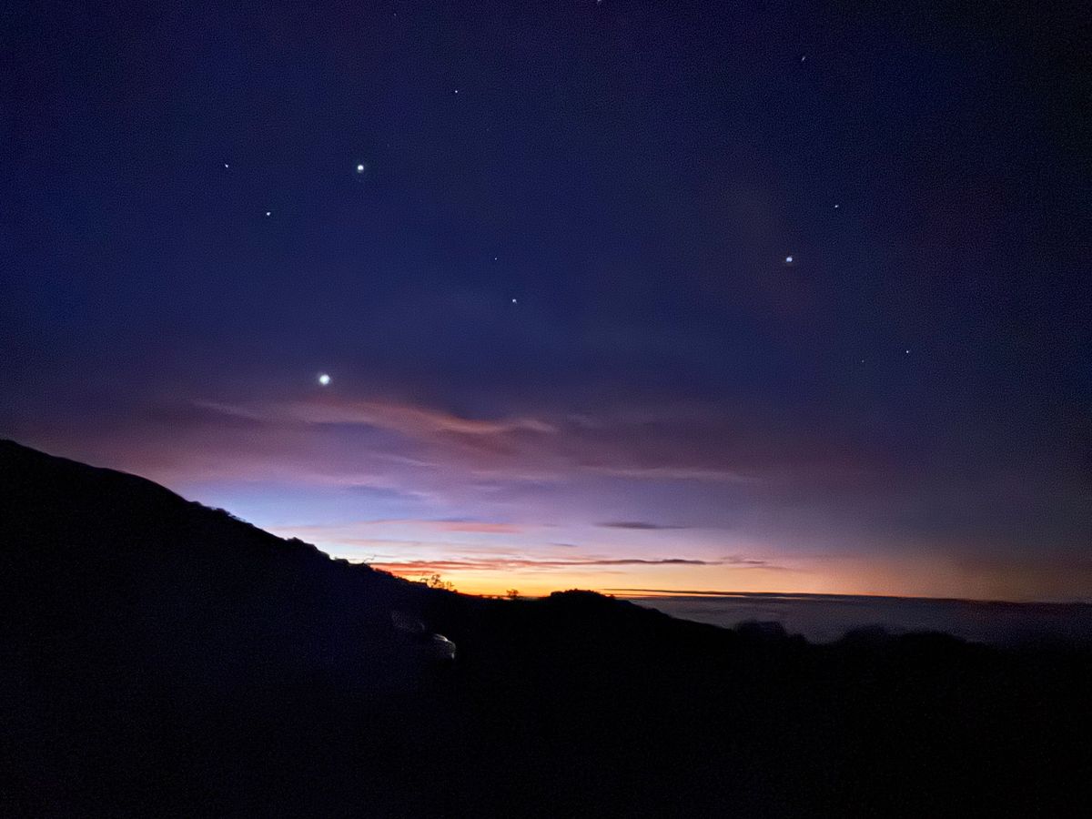 雲海を下に見ての満天の星空。あいにく月が大きくて天の川は見えなかったものの、それでも見たことのない密度の星空を見ることができました。