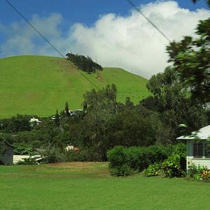 ハワイ島の東側(ヒロ周辺)の降水量は日本の2倍という話で、この日もご多分に漏れずヒロの街に入る時と出て暫くは雨が降っていました。