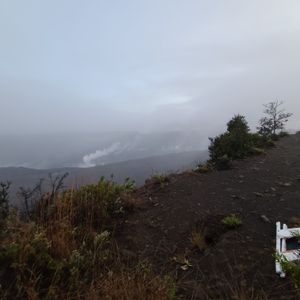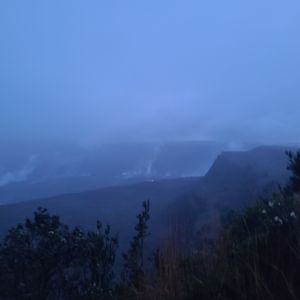 キラウエア火山ではツアー前日に活動沈静化したとのアナウンスが発表され、天気と相まって溶岩が見れないかも?と思っていましたが、夕暮れに火口に着いたときは雨とガスで火口も見えにくい状況でしたが、日没後雨もほぼ止み、チラリとだけでしたが火口の縁に赤く燃える溶岩を見ることが出来ました。