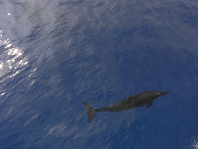 出発してすぐにイルカの群れに遭遇しました。20頭ぐらいはいたと思います。野生のイルカは初めて見たので感動でした。ちなみに、帰りも同じポイントで遭遇しましたので、この時期は日中いつもそこにいるのかも知れません。