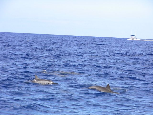 他の参加者と同じく日本人は私たちだけでしたが、ボートを操縦するMr.デュエル(~)はとてもフレンドリーなナイスガイ(たぶんあつしさんの時と同じ方では?)で、先月東京と京都に行ったよ。テレビ朝日で「Qさま」に出演したとか話してくれ、緊張がほぐれたところで、一気にボートは光り輝く水面を沖に向けて爆走。まずはイルカのベービーとご対面。上手なジャンプを堪能させていただいた後、今度はゆっくり発進。するとイルカたちが私達の前後をついてくるではありませんか!かわい~~いの連発。シュノーケリングポイントも素晴らしかったですよ。原色のお魚たちに珊瑚、うに、なまこなど、私達には“Don't touch”といっておきながらなまこをとってきて触らせてくれました。帰りはまたイルカと競争したり、火山の地層の話とかカメハメハ王の話をしてくれていたようですが、・・・・たぶん・・・??みんなと一緒に笑うことはできませんでした・・・。英語ガイドで不安もな方もあるかと思いますが、私達は中3程度の英語です。なんとかなりましたよ。私達が証明です(どこかできいたような台詞)。キャプテンゾディアックには日本語のホームページもあり、そこにメールで何点か質問しました。最初集合場所が、ホノコハウマリーナでしたが、ホテルがカイルア桟橋に近いとわかると変更してくれました。回答もとても早いです。