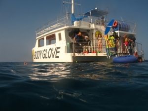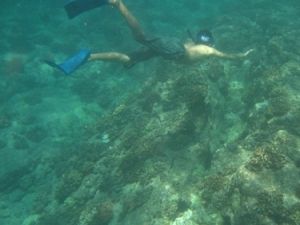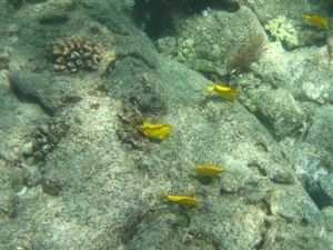 出航後、約30分の航海で目的地に着きシュノーケルをスタートします。案内は英語だけでしたが、安全に関する話が全てだろうと思っていたので、ある程度常識が有ればOKだと思います。注意されたのは「足ひれは海に入る直前まで着けない」の1点で後は特にありませんでした。4歳の娘も顔に水がつくのが嫌いなくせに、ライフジャケットで浮かんでいました。男たち3人は4mくらいの所まで潜って魚たちを見に行きましたが、なにせ、魚影が薄い・・・(この日に限ってのことなのかも?)これが一番の欠点でした。最近のハナウマがどうか知りませんが、大差はないと思います。(ハナウマの様に水は濁ってませんよ)後もう一つありました。船の舵を取ってるおじさんが全く愛想がない。他のクルーはいい人ばかりです(心配なく)。それから船に弱い人は薬は飲んでおいた方が良い場合が有ります。シュノーケル後のハムやチーズのサンドは人に依ってはヘビーかもしれませんから・・でも、また参加したいという気持ちが沸いてきました。