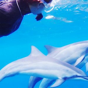 野生のイルカと贅沢シュノーケリング! 海の中ではイルカの鳴き声も聞こえてきます!