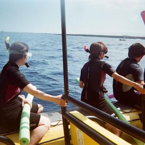 荷物は必要最小限、タオルと日焼け止めだけでいい。お水もくれる。上下繋ぎのウェットスーツとフィンも貸してくれ乗る前にサイズ合わせして準備完了。貴重品は船のベンチの中に仕舞える。履き物は乗船前に波止場で回収され素足で乗船。酔い止めは早めに飲んでおいて出船時には薬が効いてるくらいにしたほうがいいかも。