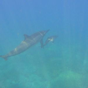 イルカの群れと並んで泳いだり、水中深く弧をえがくいるかのシルエットを追ったり、お母さんイルカのお腹にくっついて泳ぐ赤ちゃんイルカを見つけたり。中でもガイドさんが引っ張って誘導してくれた先に一匹のイルカがこちらに向かって泳いできて、目と鼻の先をスーッと横切って行った時、一瞬イルカちゃんがキョロっと私たちを見てくれたのには大興奮!「いま、目があったよね?」とお互い気のせいじゃない事を確認したのでした。最初、家族が船酔い体質のため一人で参加するか迷ったけど参加して本当によかったです。