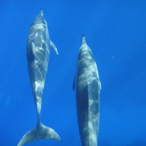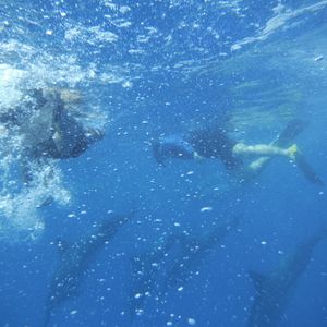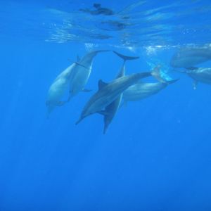 最初から、たくさんのイルカの群れと遭遇しました。キャプテンはたくさんのイルカとなるべく近くに行けるようにと、その後4〜5回は船で移動を繰り返してくれて、どのスポットもたくさんのイルカと出会いました。ガイドさんも一緒に海に入り、イルカの近くに誘導して下さいました。海の中も透明できれいでした。最後スポットでは、自分たちのちょうど真下を大きなイルカが通り過ぎてくれて感動しました。総じて50頭以上と出会えたと思います。海の中で鳴き声も聞こえました。