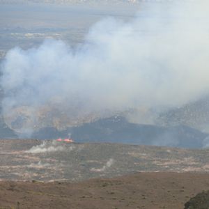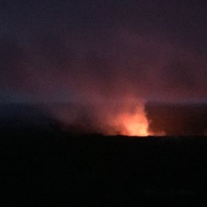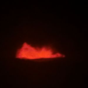 ちょっと距離あるし噴煙が赤く染まってるって感じ。